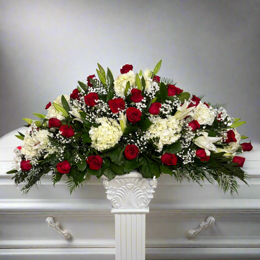 Elegant Large Funeral Casket Spray – Red Roses, White Lilies & Hydrangeas