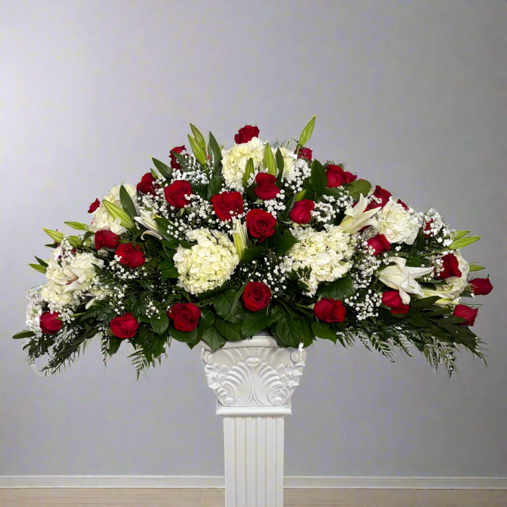 Elegant Large Funeral Casket Spray – Red Roses, White Lilies & Hydrangeas